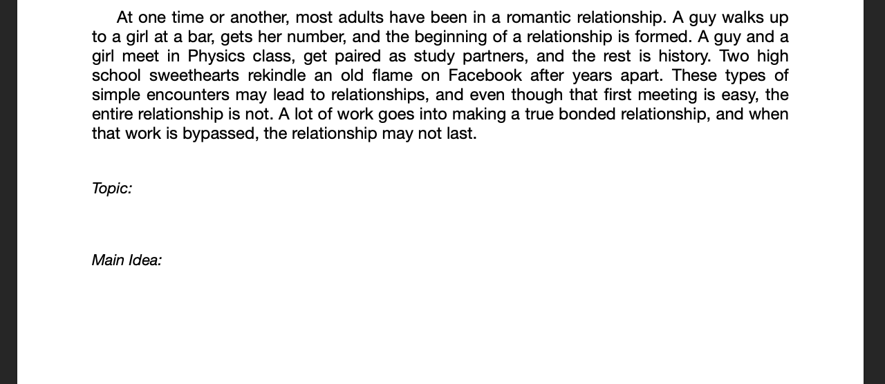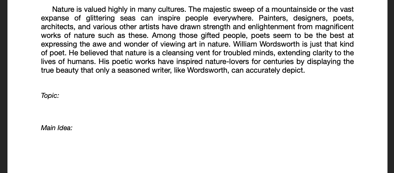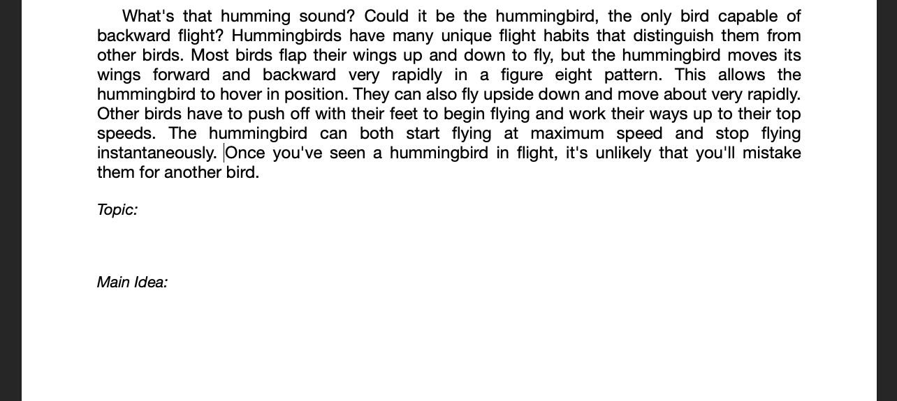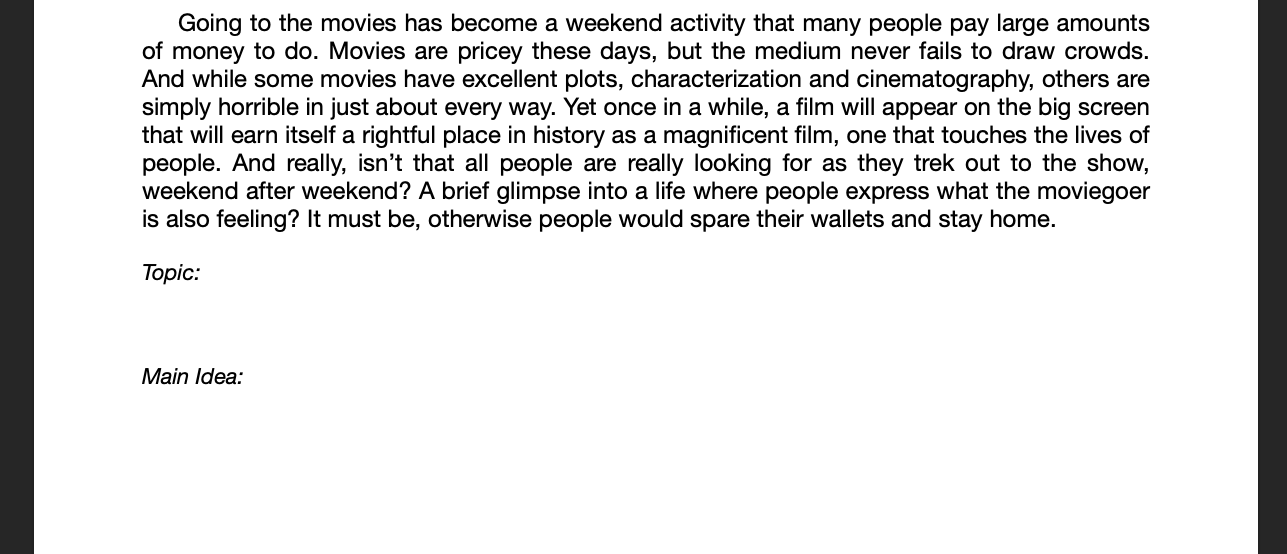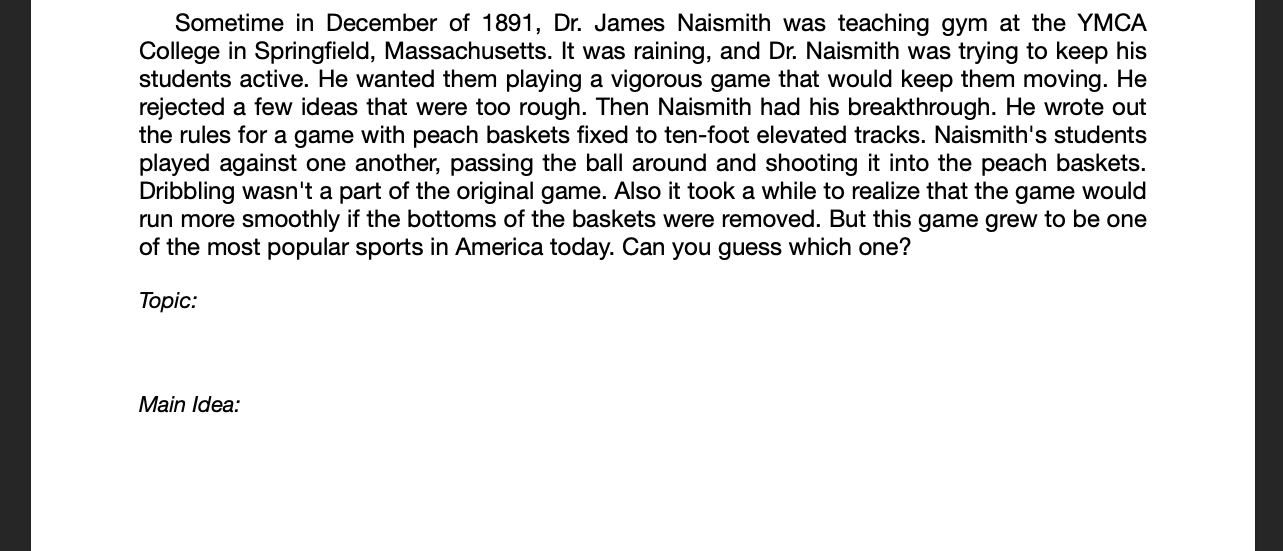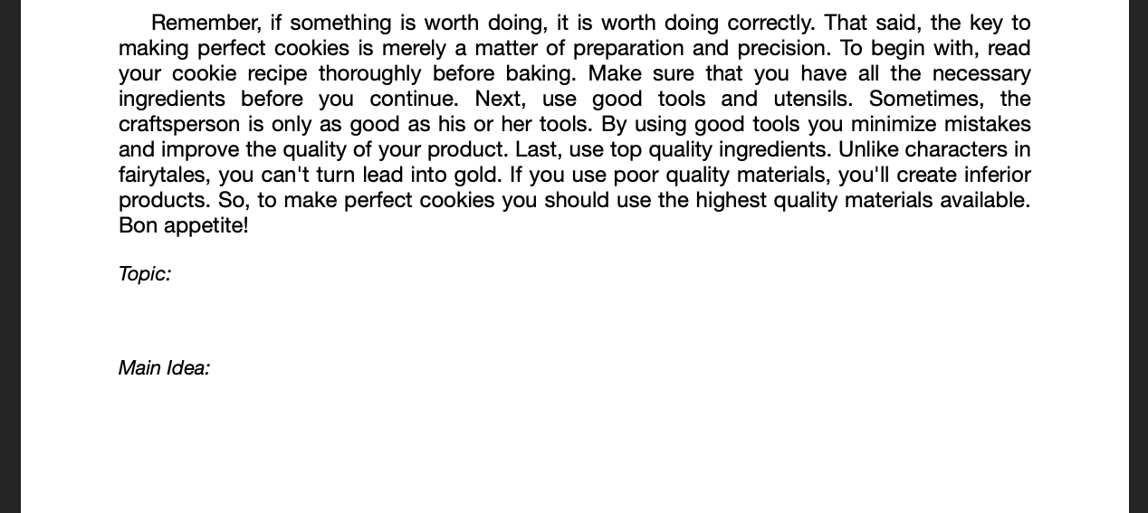 The quiz below is a practice. Don't worry about getting right or wrong answers. You will not be scored on whether you are right or wrong, you get points based on completion. You will be given 6 passages to find the topic and main idea for. You only need to do 3.