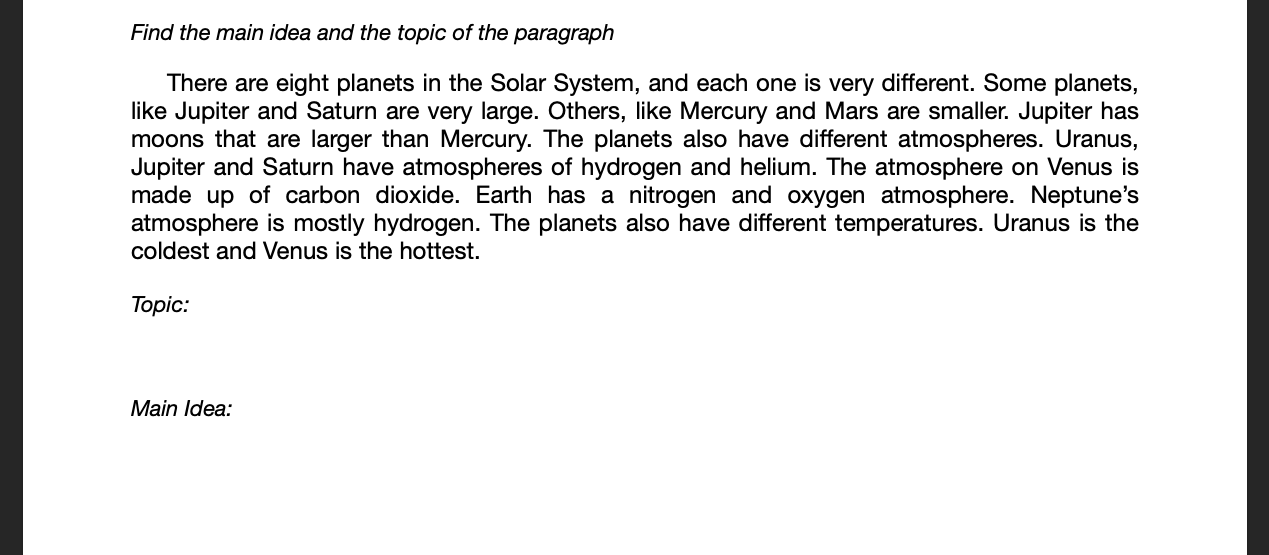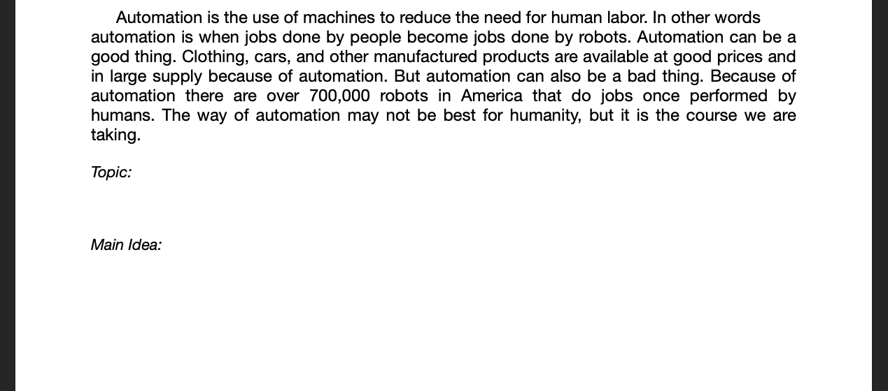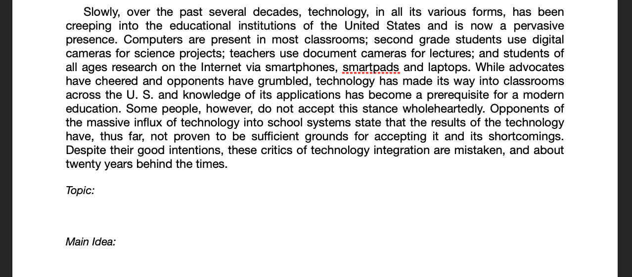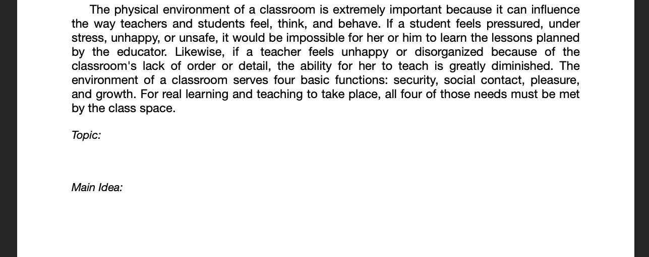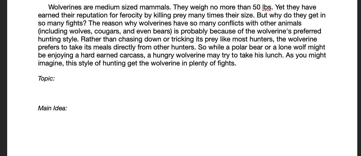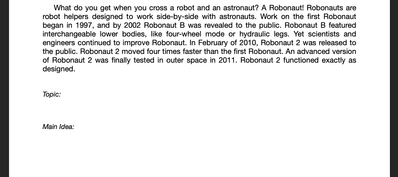 The quiz below is a practice. Don't worry about getting right or wrong answers. You will not be scored on whether you are right or wrong, you get points based on completion. You will be given 6 passages to find the topic and main idea for. You only need to do 3.