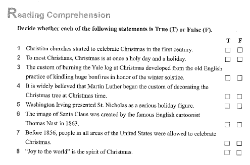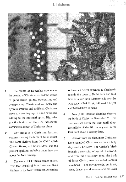 First, you will read the article called "Christmas" that begins on page 155 in your textbook. Then, you will answer the reading comprehension questions. After that, we will explain or illustrate the meaning of some key points in the article. Finally, we end with some activities.