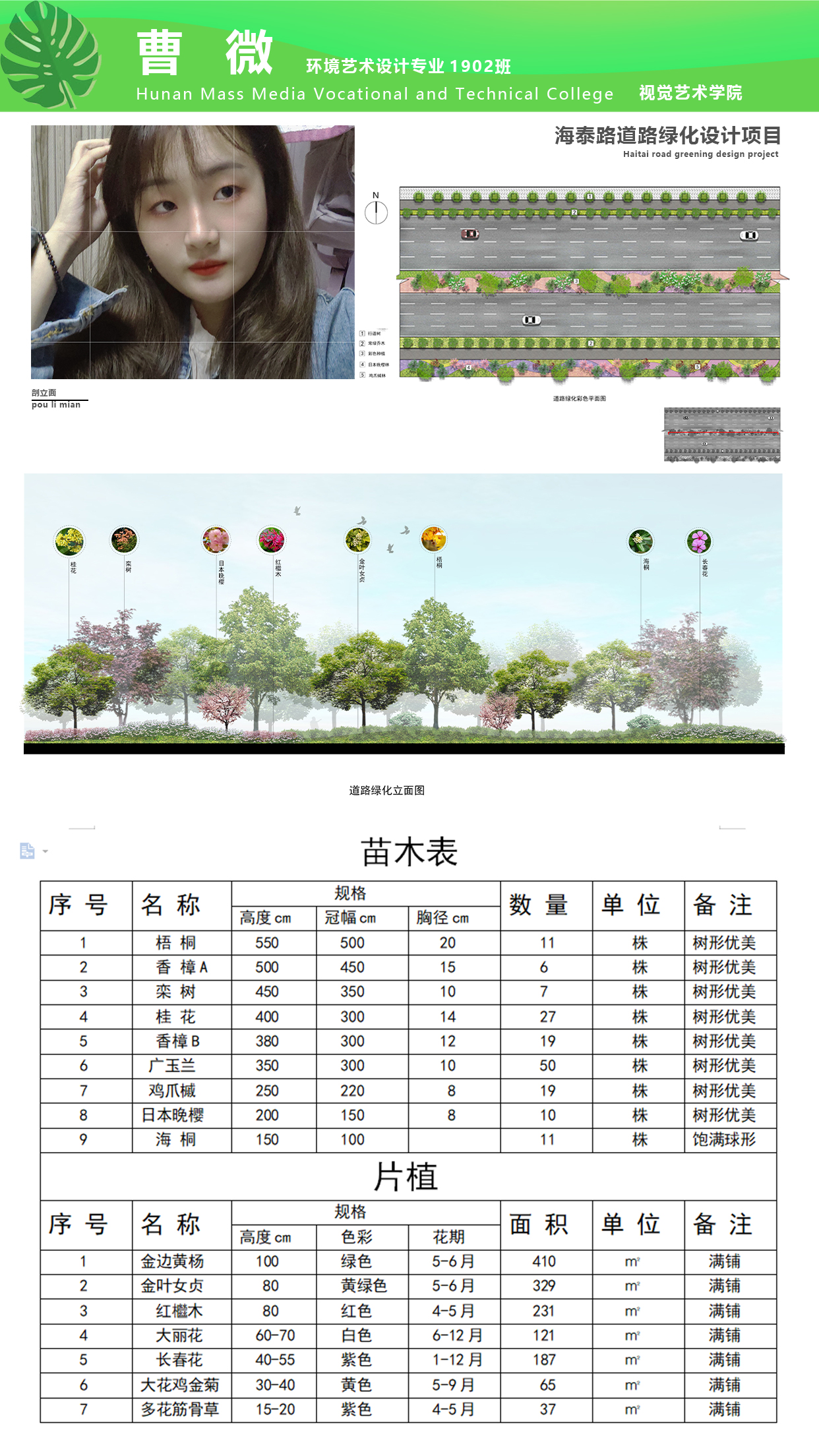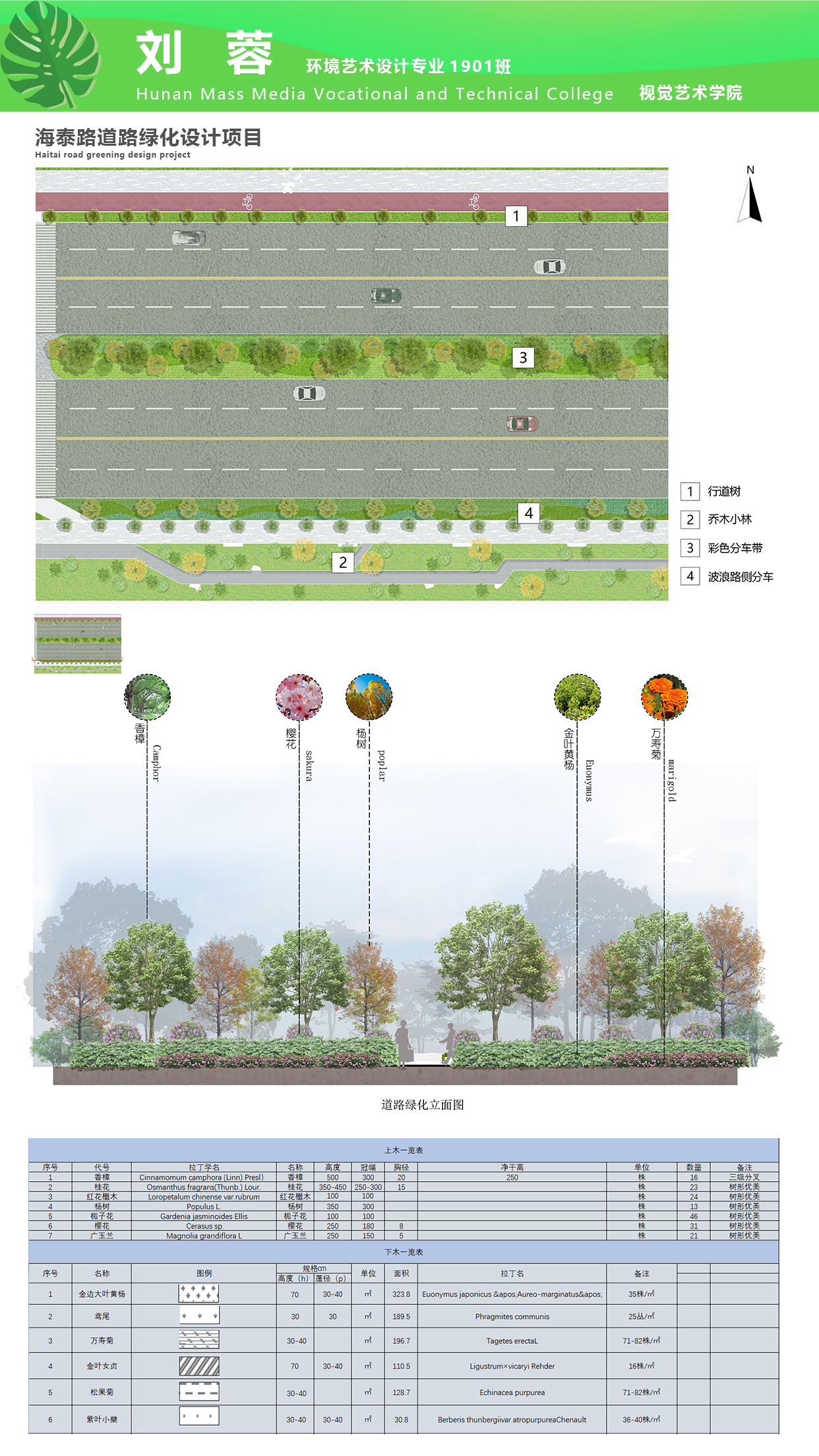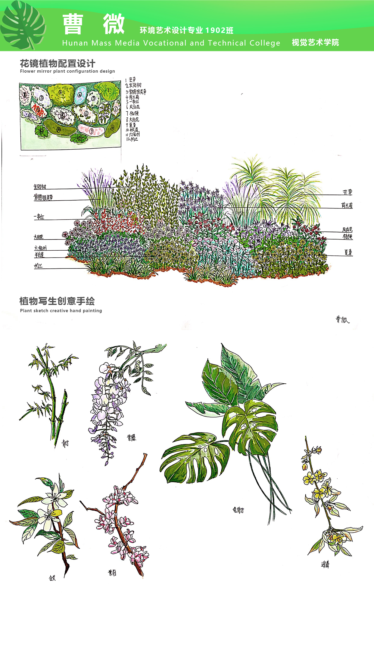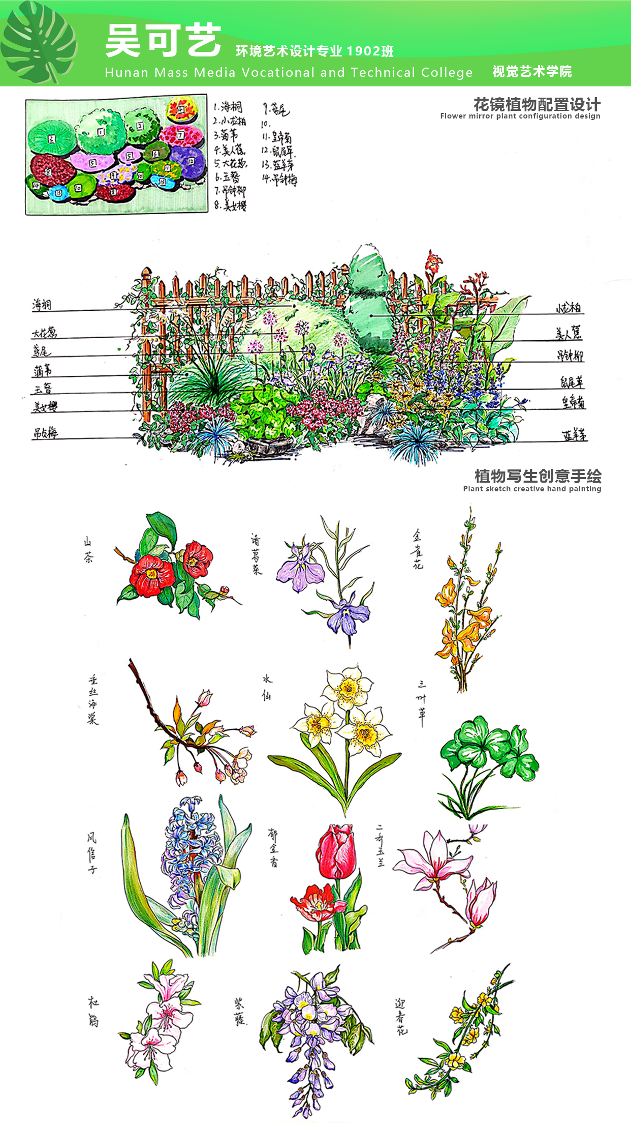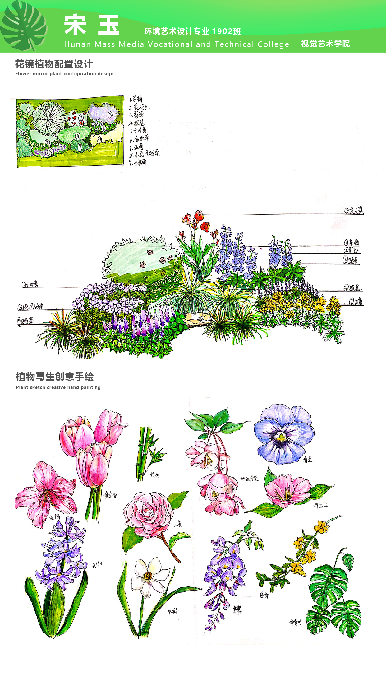 2021年上学期,环境艺术设计专业1901班、1902班展开了《植物配置》课程的学习,通过线上线下混合式教学模式的初探,同学们分别完成了海德湿地公园绿化设计项目、海泰路道路绿化设计项目两项校企合作项目,同时还完成了物流园种植池设计,庭院花镜设计等课程作业。他(她)们对待作品精益求精,反复打磨,在课程结束期间也收获了大批量优秀的设计作品。同时,在课程教学中有机融入了共建“绿水青山”应是环艺人的责任与使命课程思政,开展了维护校园植被劳动教育的实践活动。由于新冠疫情,今天在线上展示同学们优秀的课程作品以资鼓励,或许还存在一些不足,但这却是作为未来环境艺术设计的学生们用心耕耘的成果,是他(她)们辛勤劳动的见证、是他(她们美好青春的回忆……,在此真诚的恳请您提出宝贵的建议,并表示、诚挚的感谢。