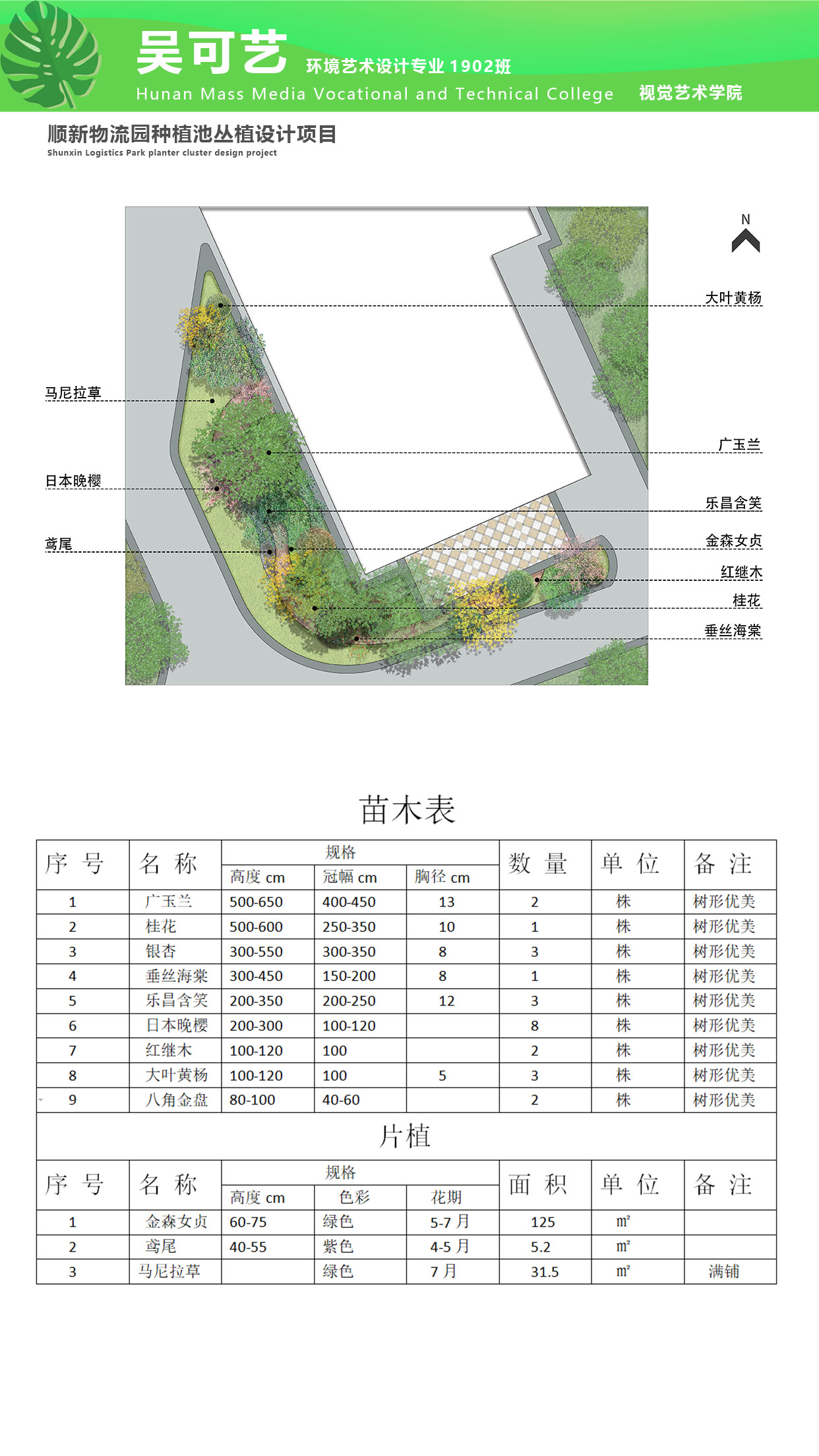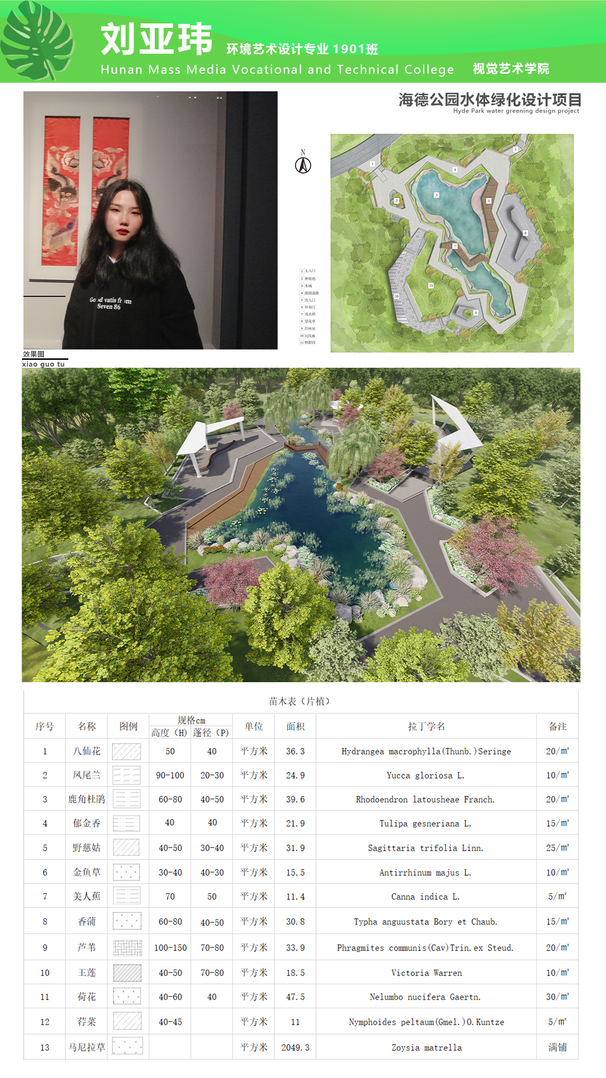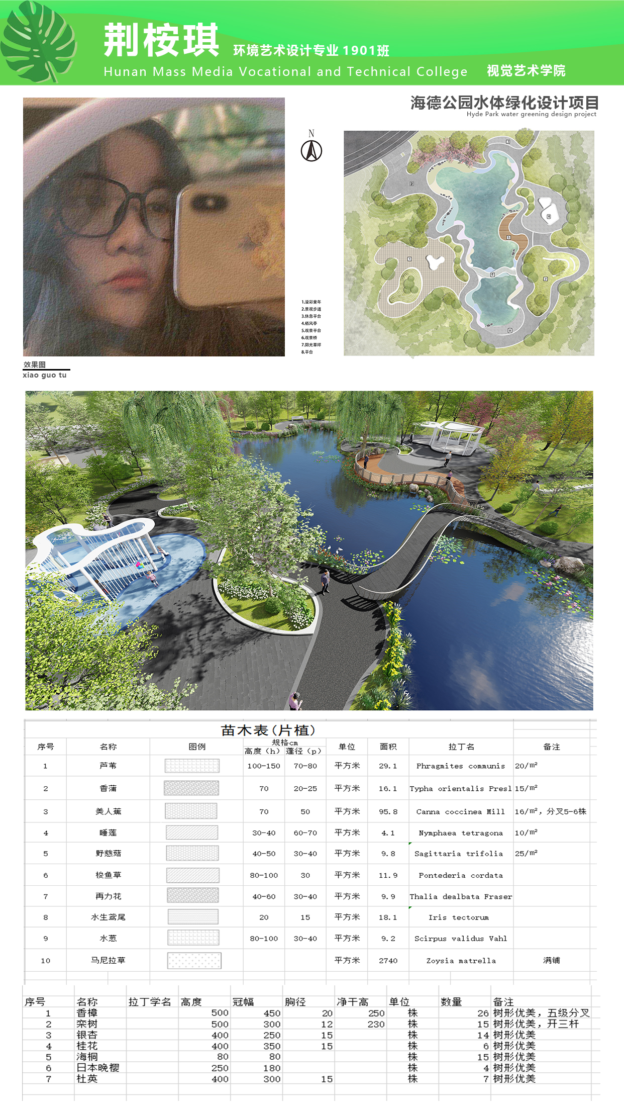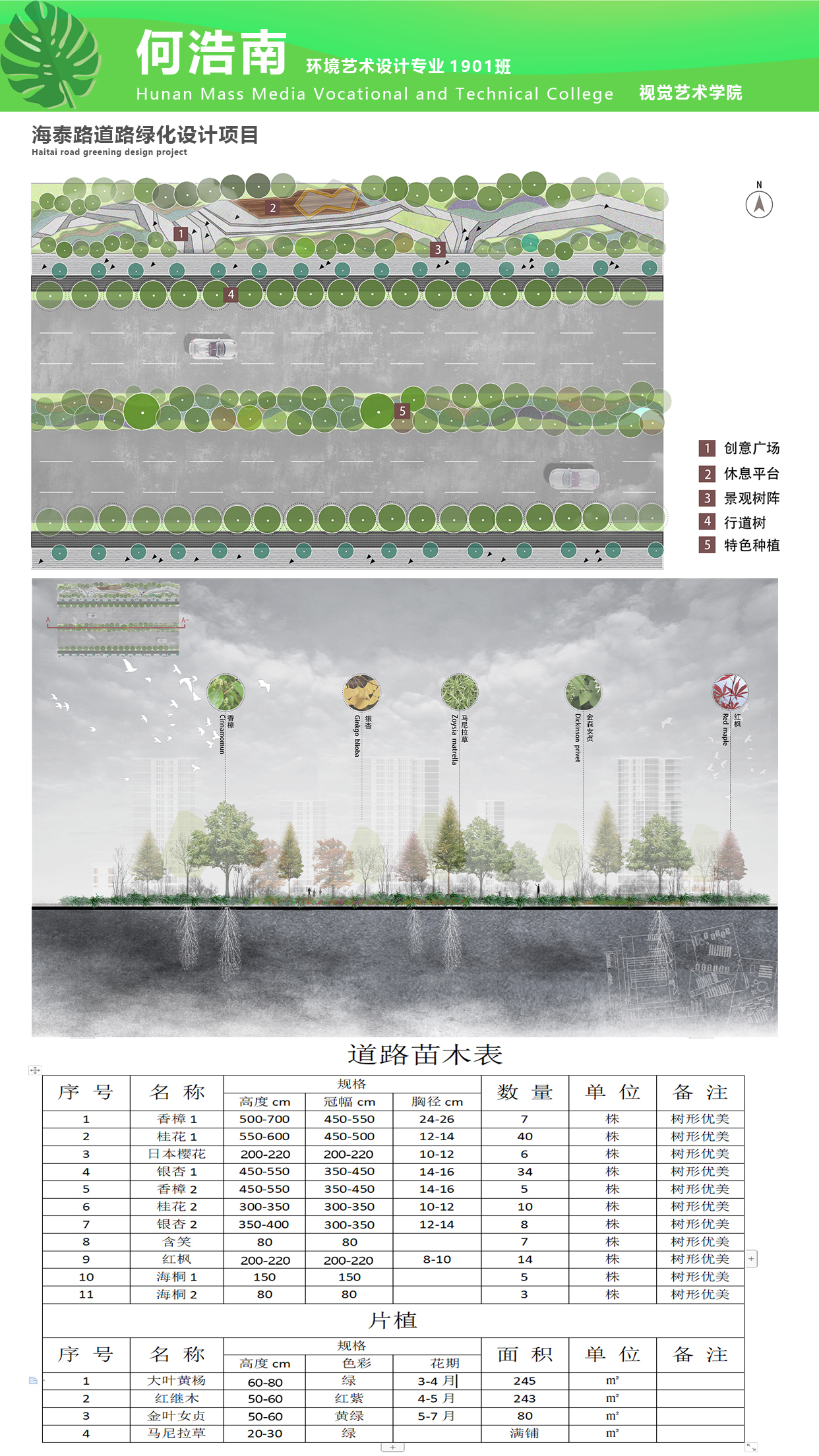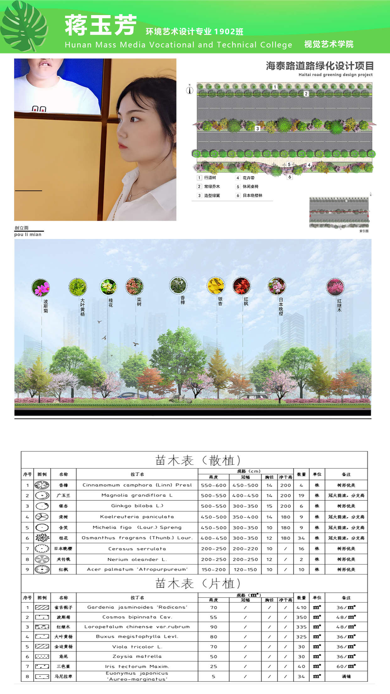 2021年上学期,环境艺术设计专业1901班、1902班展开了《植物配置》课程的学习,通过线上线下混合式教学模式的初探,同学们分别完成了海德湿地公园绿化设计项目、海泰路道路绿化设计项目两项校企合作项目,同时还完成了物流园种植池设计,庭院花镜设计等课程作业。他(她)们对待作品精益求精,反复打磨,在课程结束期间也收获了大批量优秀的设计作品。同时,在课程教学中有机融入了共建“绿水青山”应是环艺人的责任与使命课程思政,开展了维护校园植被劳动教育的实践活动。由于新冠疫情,今天在线上展示同学们优秀的课程作品以资鼓励,或许还存在一些不足,但这却是作为未来环境艺术设计的学生们用心耕耘的成果,是他(她)们辛勤劳动的见证、是他(她们美好青春的回忆……,在此真诚的恳请您提出宝贵的建议,并表示、诚挚的感谢。