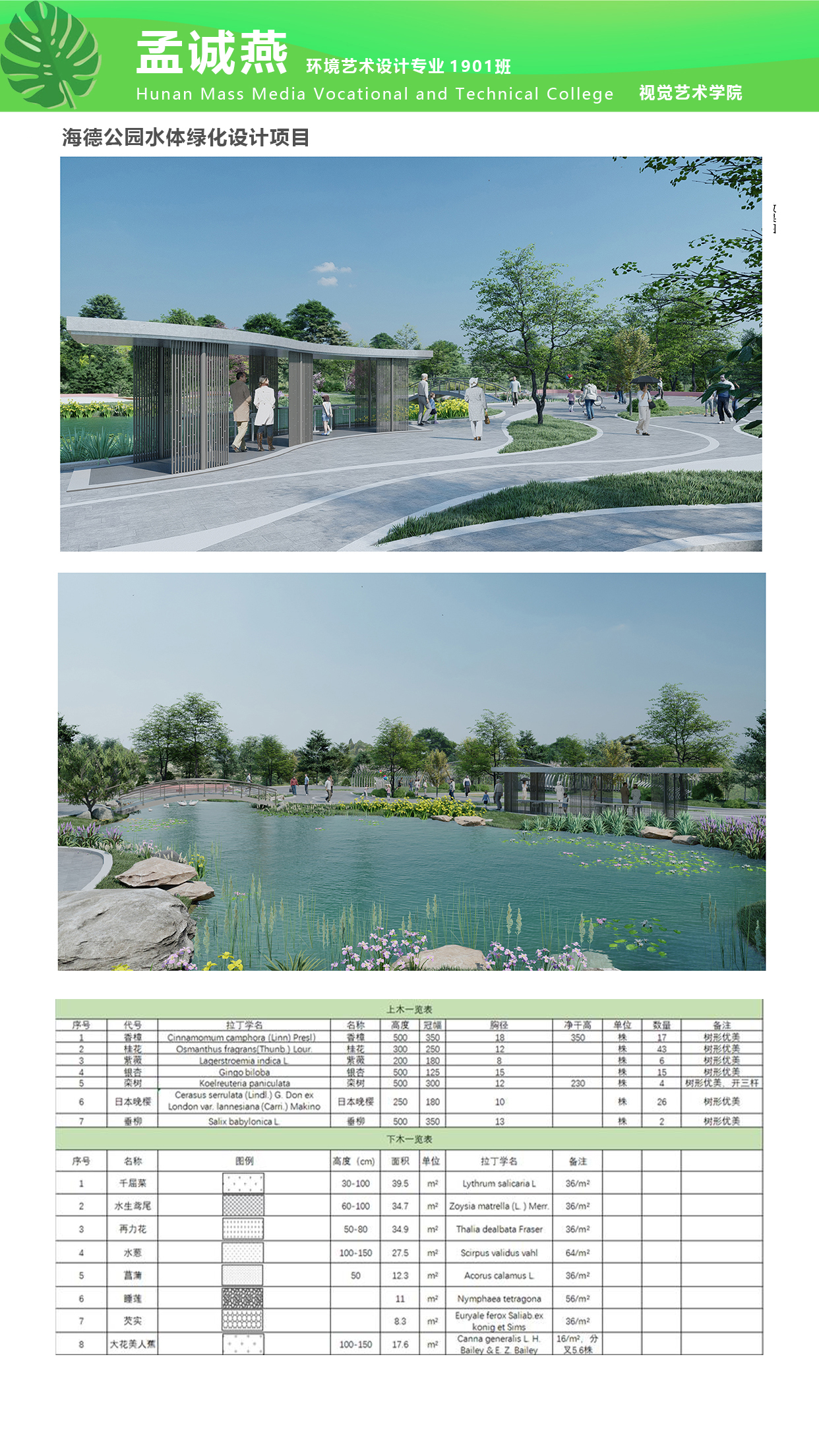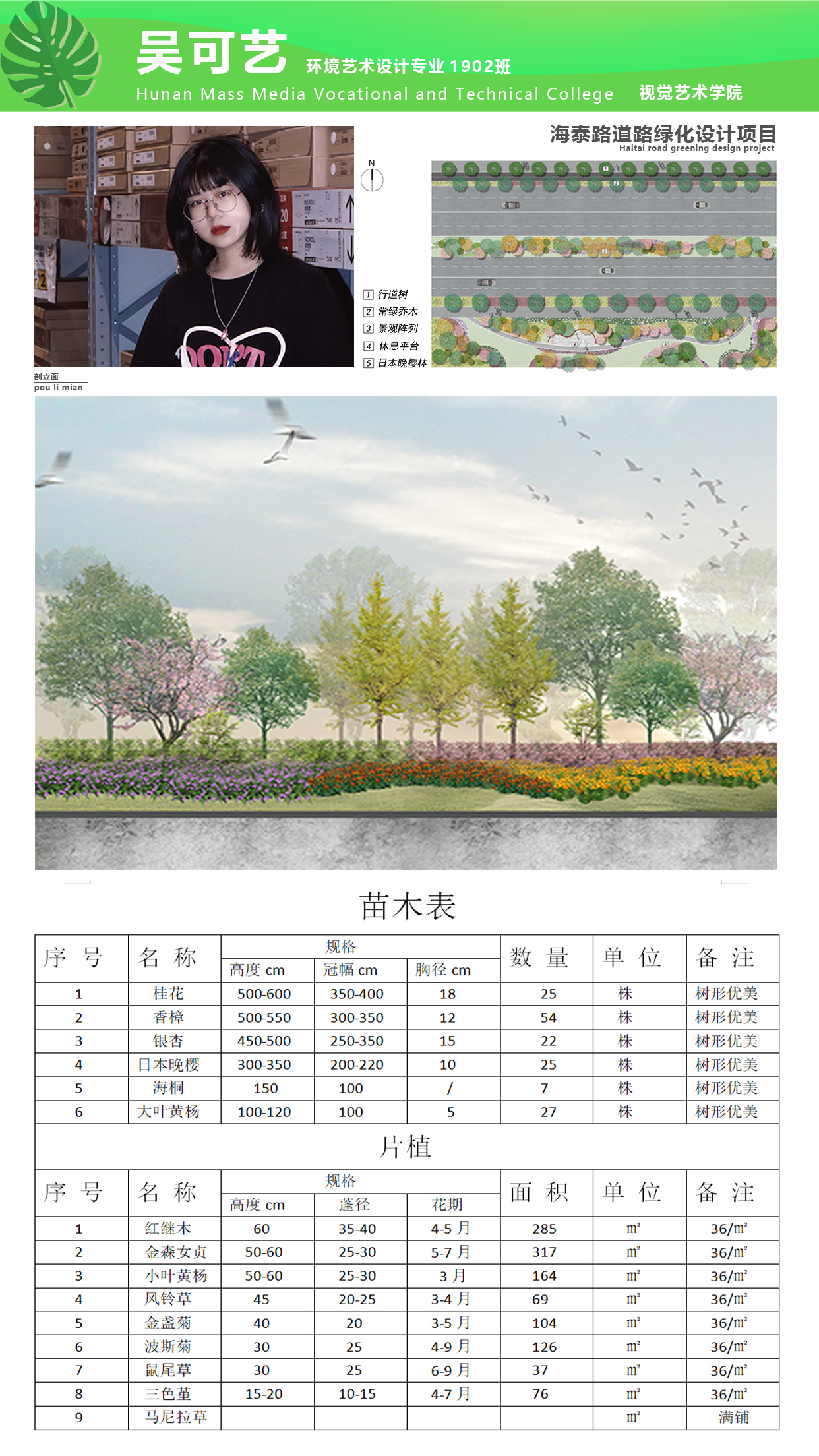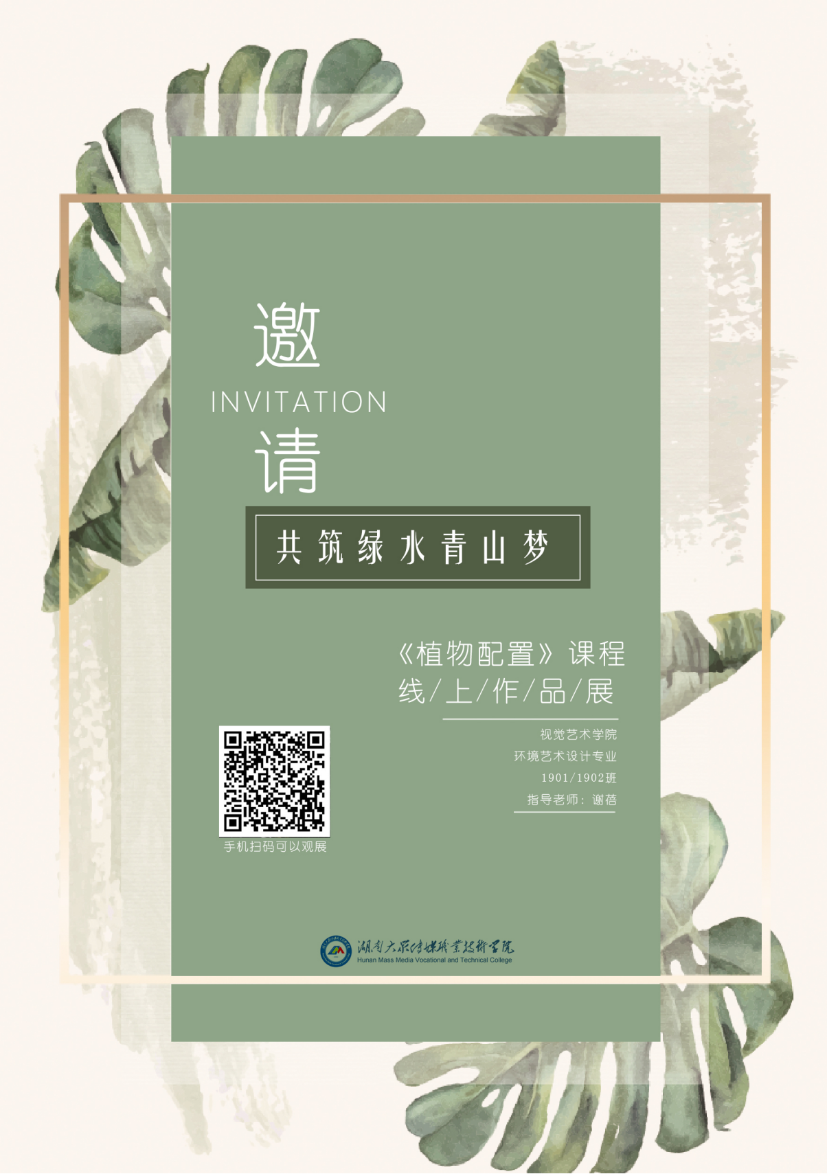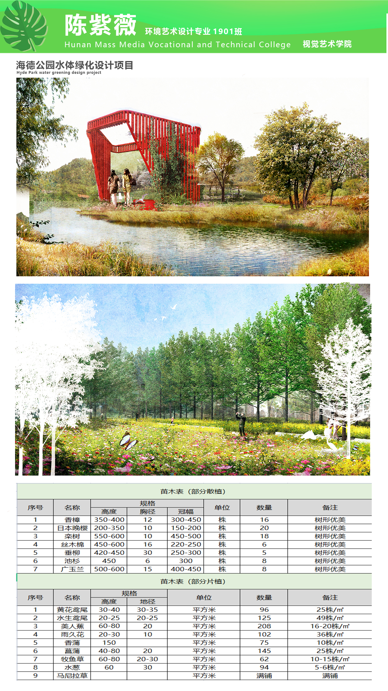2021年上学期,环境艺术设计专业1901班、1902班展开了《植物配置》课程的学习,通过线上线下混合式教学模式的初探,同学们分别完成了海德湿地公园绿化设计项目、海泰路道路绿化设计项目两项校企合作项目,同时还完成了物流园种植池设计,庭院花镜设计等课程作业。他(她)们对待作品精益求精,反复打磨,在课程结束期间也收获了大批量优秀的设计作品。同时,在课程教学中有机融入了共建“绿水青山”应是环艺人的责任与使命课程思政,开展了维护校园植被劳动教育的实践活动。由于新冠疫情,今天在线上展示同学们优秀的课程作品以资鼓励,或许还存在一些不足,但这却是作为未来环境艺术设计的学生们用心耕耘的成果,是他(她)们辛勤劳动的见证、是他(她们美好青春的回忆……,在此真诚的恳请您提出宝贵的建议,并表示、诚挚的感谢。