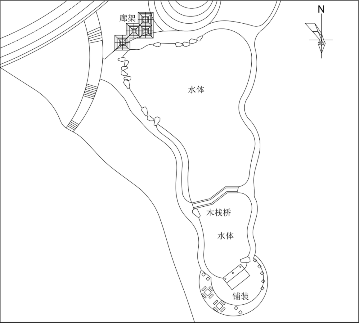 公园内部由游园路、凉亭、木栈道、水体、清水平台等景观设计要素,公园的北边和西边都是相邻的居住区,水体中的岸边的潜水区域的水深大约为0.4-0.6cm,中间的深水的区域水深约为6m左右的深度,在木栈道区域也属于潜水区域。