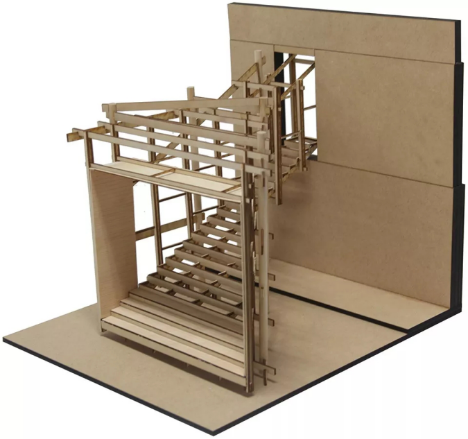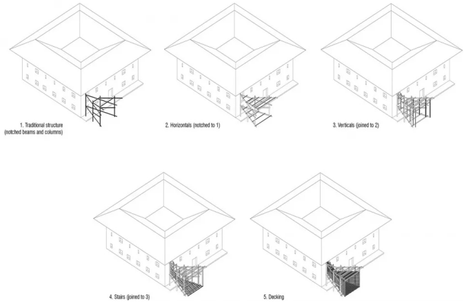“插件Plug-In”是由两个全木结构的主要构件和五层结构部件组成的,它们依据特定的空间层次共同构造而成。固定的外框架由传统的圆柱和接点构成。它形成了一个可供漏斗形的楼梯悬挂其上的脚手架。