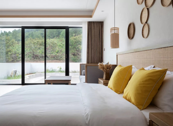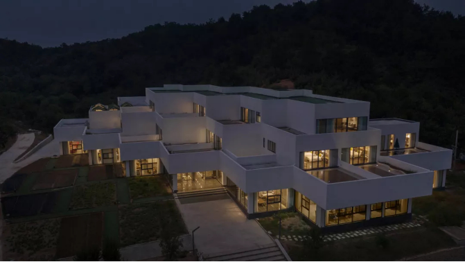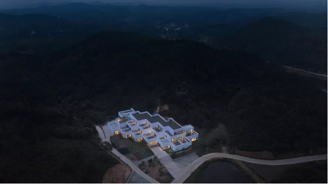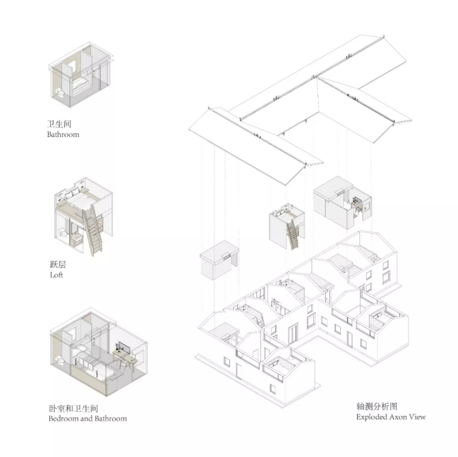 建筑共三层,设计团队选取“层叠退台”作为建筑的基本形式:下一层的顶部成为上一层房间的户外活动空间,每个客房都有独立的“空中小院”,丰富了住宿的体验。