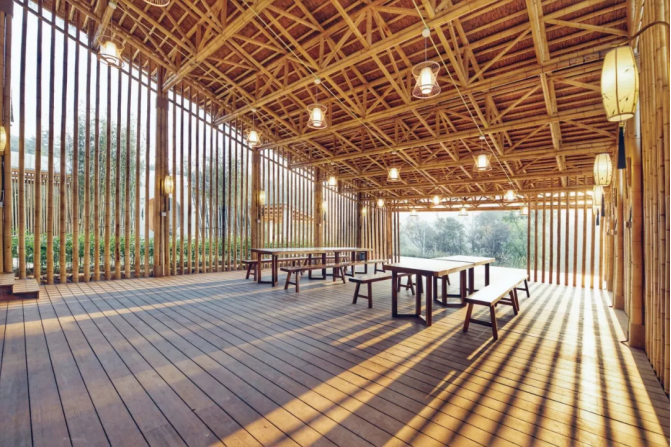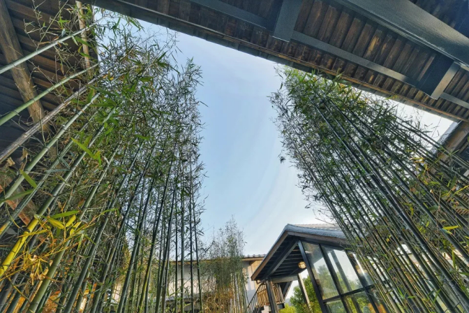 整个改造的核心目的在于创造一个大体量的“会客厅”,能够接待来客、开会、培训或者喝茶小聚。为了不遮挡老宅,我们选择了离入口的最远的两间前面设计了一个大空间,为了降低造价同时施工简便,竹结构成为了优选。但是我们的最高点不能高于老宅檐口,同时最低点要和门房差不多,以不破坏原有的空间格局。