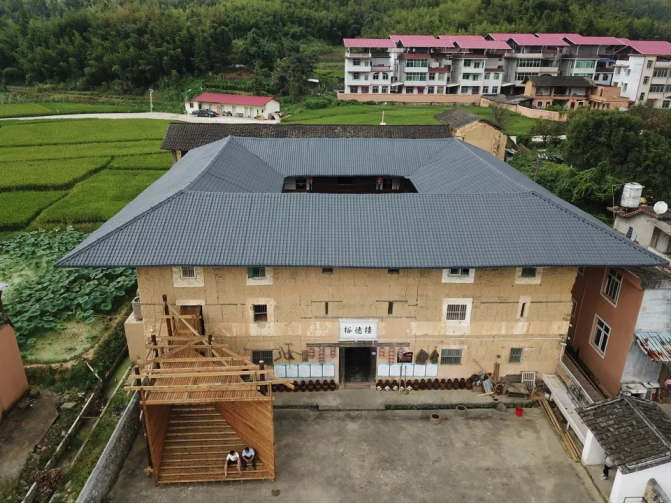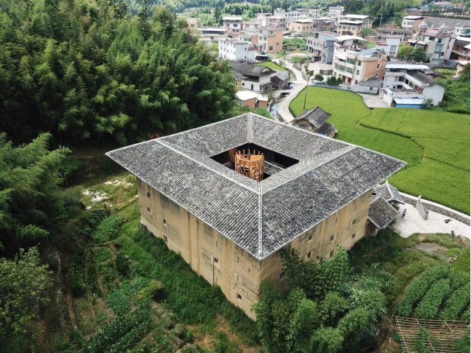 在一千多年前的中国南方,激烈好斗的客家文化催生了大型内向式土制建筑(土楼)的出现。日渐扩增的大家族修建了厚土墙来达到集体防御的目的,并利用建筑中庭,为农耕活动提供了一个共享的开放空间。在传统的土楼中,每一户独立家庭的房间竖向分布,每个房间都可以通向共用的走廊和阳台。