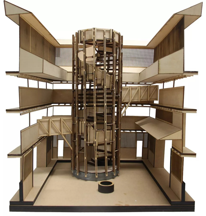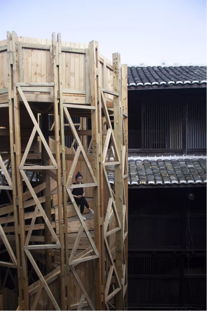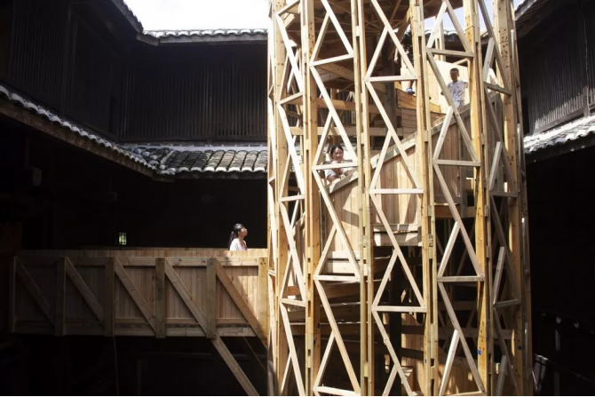 “塔”的设计通过将传统的集体庭院空间抬升,并以通天式的螺旋楼梯连接原有楼层,对土楼的公共空间进行了重新思考。新的公共功能由此被引入。