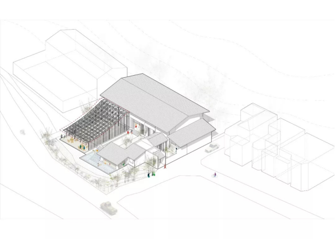 △ 形体生成示意图 建筑界面采用折面屋顶,如同村庄的剪影,房子不高,后面的老屋犹在,形成山地建筑群特有的错落感。屋面采用当地传统的青瓦铺设,深瓦白脊,特色鲜明,立面采取钢结构与木结构相结合,既传统而又现代,是福州山区传统建造与现代技术的有机结合,也是福建新乡土建筑的一次探索。