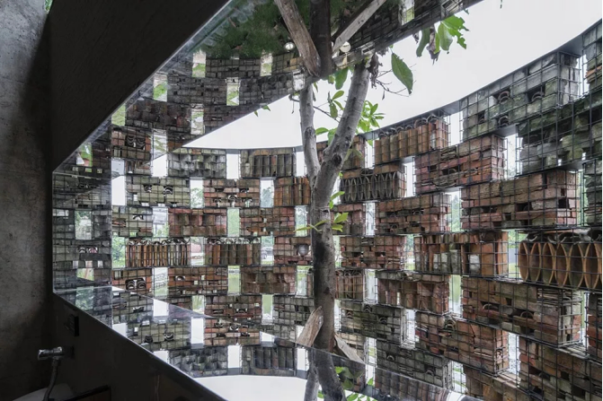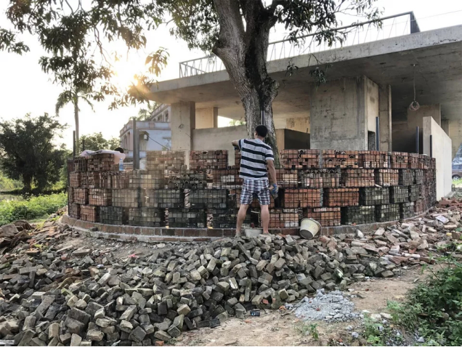 整个墙体的施工过程都遵循重力规则,越往上部的笼子,需要承受的重量就越小,垒砌的自由度也就越大,在材料上运用了更多的瓦、碎砖、旧茶壶等特别的材料,在砌筑方式上也采用了更多的镂空,使砖墙显得更加通透。日出或日落时,阳光透射进来,穿过这些砖墙的缝隙,洒落在地面或墙角,成了点点金色的光斑。