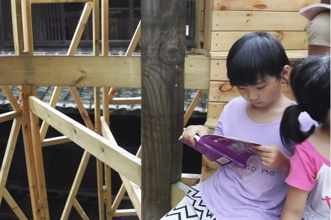 变化的台阶节奏引导人们在楼梯上坐下,阅读,甚至喝茶。一座桥与土楼的上层外廊相连,由此形成了一个公共阅读室,而塔顶则成为观赏风景的地方。