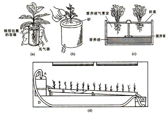 a.水培法:使用不透明的容器(或以锡箔包裹容器),以免光照及藻类繁殖,并注意通气;沙培法;c. 气栽法:根悬于营养液上方,营养液被搅起成雾状;d. 营养膜法:营养液从容器A流进长着植物的浅槽B,未被吸收的营养液流进容器C,并经管D泵回A,营养液成分及pH可自动调控 (引自Salisbury Ross,1992)