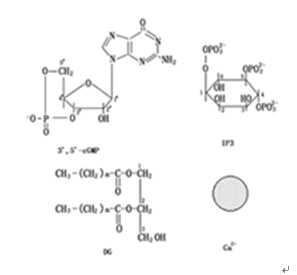 环核苷酸主要是指cAMP和cGMP。cAMP作为重要的第二信使物质在动物细胞中早已定论。当某些胞外刺激作用于动物细胞时,激活细胞质膜上的特异性受体,然后通过G蛋白介导促进或抑制膜内侧的腺苷酸环化酶,从而调节胞质的cAMP水平,cAMP作为第二信使调节细胞的生理生化反应。然而,植物细胞中的cAMP是否普遍存在以及是否也具有象动物细胞类似的第二信使作用,尚无定论。目前已在某些植物中测到cAMP的存在,但其浓度远低于动物细胞中的有效生理浓度。另一方面,有报道证明外加cAMP可以引起植物细胞的生理反应。说明cAMP作为植物细胞的第二信使是可能的。关于植物细胞是否存在cAMP合成和降解酶(腺苷酸环化酶和环核苷酸磷酸二酯酶)也还没有最终从蛋白质和基因水平得到确切证据。其次植物细胞内是否存在cAMP的靶蛋白也缺乏确切证据。总之,cAMP是否作为植物细胞内第二信使尚无定论。在动物细胞中,cGMP信号的产生与cAMP类似,是由鸟苷酸环化酶催化的,而cGMP降解则由环核苷酸磷酸二酯酶完成,cGMP作为第二信使的作用方式与cAMP类似。近年来,cGMP作为第二信使在植物细胞中的作用也有了一定进展,如蔡南海实验室证实了叶绿体光诱导花色素合成过程中,cGMP参与了受体、G蛋白之后的下游信号转导过程。