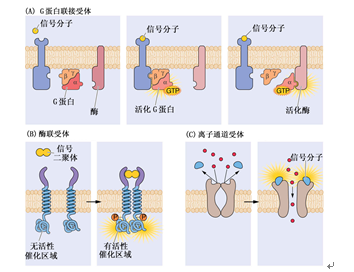 根据受体在细胞中存在的部位,可将受体分为细胞表面受体和细胞内受体。前者位于细胞质膜上,后者则位于细胞内的亚细胞组分上。细胞表面受体包括:(1)G蛋白联接受体(G protein-linked receptor),受体蛋白的氨基端位于细胞的外侧,羧基端位于细胞内侧,一条单肽链形成几个(多为7个)跨膜a螺旋结构。羧基端具有与G蛋白相互作用的区域,受体活化后直接将G蛋白激活,进行跨膜信号转换(图5-2A)。(2)酶联受体(enzyme-linked receptor),受体本身是一种酶蛋白,当胞外侧区域与配体(如信号二聚体)结合时,可激活酶,通过胞内侧酶的反应传递信号(图5-2B)。(3)离子通道连接受体(ion-channel-linked receptor),即除了含有与配体特异结合的部位外,这种受体本身就是离子通道,受体接受信号后立即引起离子的跨膜转移(图5-2C)。