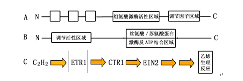 A:乙烯受体蛋白ETR1结构示意图 B:乙烯信号传递负调节因子CTR1结构示意图 C:乙烯信号转导机制模式图