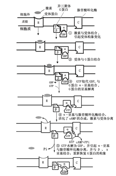 G蛋白不仅把胞外信号转换为胞内信号,而且起信号放大作用,即每个与配体结合的受体同时可以激活多个G蛋白分子,每个G蛋白分子激活一个腺苷酸环化酶,后者又可催化产生大量cAMP。cAMP又可作为第二信使通过以后的信号的转导途径进一步传递并放大信号。