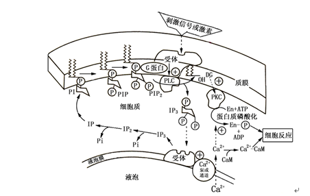 由胞外刺激信号激活或抑制的、具有生理调节活性的细胞内因子称为第二信使(secondmessenger)。到目前为止在植物细胞中的第二信使系统主要是环苷酸信号系统、钙信号系统和磷脂酰肌醇信号系统。