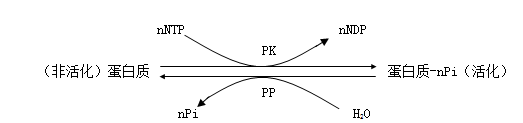 蛋白质的可逆磷酸化是生物体内一种普遍的翻译后修饰方式。蛋白质磷酸化与脱磷酸化分别由蛋白激酶(protein kinase , PK)和蛋白磷酸酶(proteinphosphatase , PP)催化完成。PK催化ATP或GTP g位的磷酸基因转移到底物蛋白质的氨基残基上,而PP则催化去掉磷酸化蛋白质的磷酸基因。