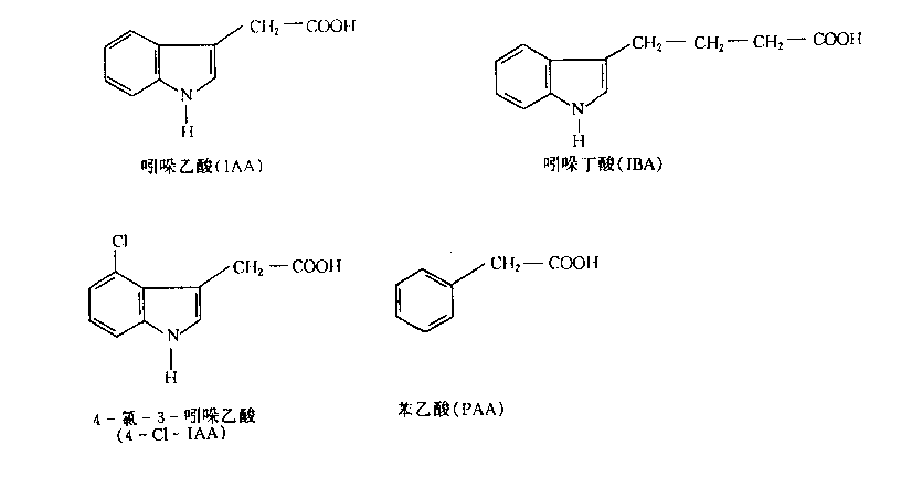 现已证明,植物体内生长素类物质以IAA最为普遍,它存在于细菌、真菌、藻类、蕨类和种子植物中。除IAA外,植物体内还有其他生长素类物质。如4-氯-3-吲哚乙酸(4-chloroindole-3- acetic acid,4-Cl-IAA)存在于豌豆、山黧豆等豆类未成熟的种子中;苯乙酸(phenylacetic acid, PAA)存在于蕃茄、烟草等一些作物中,其生理活性比IAA低的多,但在植物中也广泛分布,含量比IAA更丰富;吲哚丁酸(indole butyric acid,IBA)最初被认为只是一种人工合成的物质,但近年来已从玉米和其他植物的种子和叶片中被提取出来,因此它也很可能广泛分布在植物界(图6—2)。