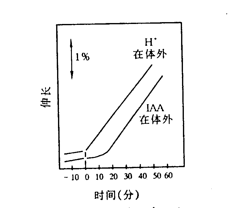 Ray等通过试验证明植物细胞在酸性环境中伸长速度加快。他将1cm长的燕麦胚芽鞘切段,放在一个密闭的小室中,一端固定在柠檬酸缓冲液(pH 3)中,让液体流过小室,在显微镜下观察,1 min内就可测出胚芽鞘的伸长。若将胚芽鞘放入一定浓度的生长素溶液中,可发现10-15 min后切段开始迅速伸长,两种处理表现出相似的生长反应,只是生长反应的迟滞期长短不同(图6-9)。酸所促进植物组织伸长生长反应被称为“酸生长效应”,此效应在南瓜下胚轴、豌豆茎切段试验中也得到了证实。