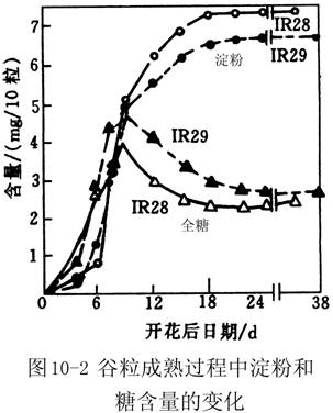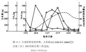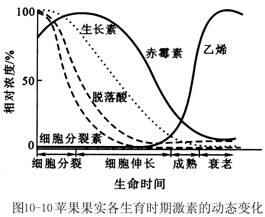 在果实成熟时,各种内源激素都发生明显变化。一般在幼果生长期,生长素、赤霉素和细胞分裂素的含量增高,到了果实成熟时,都下降至最低点,而乙烯、脱落酸含量则明显升高(图10-10)。