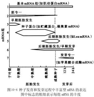 大豆后期发育阶段的合子胚研究表明:处于中熟阶段胚内存在的15,000种mRNA中,90%以上也在子叶胚和成熟胚中存在,并且贮存在成熟种子中和出现在幼苗、长成叶中,只有少量的基因仅在胚中表达(图10-6)。在小麦、水稻、大豆等作物种胚中均有上述“长命”(long lived)mRNA的存在,它们对种子萌发早期水解酶的形成以及胚根的发端起着重要作用。作为基因表达产物的磷酸脂酶、呼吸氧化酶等活性,均伴随着胚胎发生过程而表现出相应的变化。
