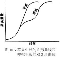果实的生长的过程呈现周期性特点,但植物的种类不同,果实生长的特点也不同。生长曲线主要有两种类型:单S型曲线和双S型曲线(图10-7)。肉质果实(如苹果、番茄、菠萝、草莓、香蕉、茄子、梨等)的生长一般也和营养生长一样,呈单S型曲线,即在开始生