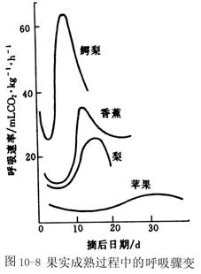 在细胞分裂迅速的幼果期,呼吸速率很高,当细胞分裂停止,果实体积增大时,呼吸速率逐渐降低,然后急剧升高,最后又下降。即果实达到一定的成熟度时,呼吸速率下降,接着突然升高,出现呼吸高峰,最后又下降,果实成熟之前发生的这种呼吸突然升高的现象称为呼吸骤变(respiratory climacteric)或呼吸峰(图10-8)。呼吸骤变的出现,标志着果实进入了完熟期并达到可食状态,完熟期的果实是不耐贮藏的。