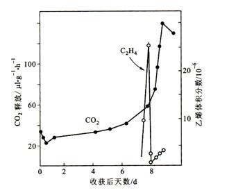 在果实呼吸骤变正在进行或正要开始前,果实内乙烯的含量有明显的升高(图10-9)。因此,人们认为果实发生呼吸骤变的另一重要原因是乙烯的产生和释放。乙烯影响呼吸作用的机理可能是:乙烯通过受体与细胞膜结合,增强膜透性,使气体交换加速,提高果实内部的氧浓度,使氧化作用加强,促进淀粉、脂肪等迅速转化成可溶性糖,提高呼吸底物的浓度,促进呼吸出现呼吸高峰,进而加速了果实成熟;乙烯可诱导呼吸酶的mRNA的合成,提高呼吸酶的含量,并可提高呼吸酶活性,对抗氰呼吸有显著的诱导作用,可明显加速果实的成熟和衰老过程。
