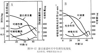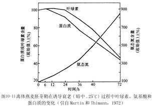 植物的衰老(senescence)是植物体生命周期的最后阶段,是成熟的细胞、组织、器官和整株植物自然地终止生命活动的一系列衰退过程。其主要特征:第一,衰老是植物生长发育的最后一个阶段;第二,衰老是一个走下坡路的正常生理阶段,是不可逆的;第三,这一阶段包括一系列的代谢变化,错综复杂。所以Thimann又将这些复杂的衰退过程称为“衰老综合症”(senescence syndrome)。衰老的普遍特征之一是蛋白质水平的明显下降(图10-11),即衰老过程总的表现为氮的负平衡。与此同时,在植物衰老过程中还伴随着呼吸速率的变化和乙烯的产生等。植物的自然死亡是衰老过程的终极。衰老不同于成熟,因为成熟是生命周期中另一个发育高峰的开始。衰老也不同于老化(aging),老化是指在生命活动的发育进程中,在结构和生理功能方面出现进行性的衰退变化,其特点是机体对环境的适应能力逐渐减弱,但不立即死亡。它主要由遗传基因控制,但也受环境条件影响。而衰老的结果是导致死亡,这是自然界生命发展的必然规律。
