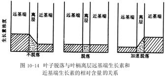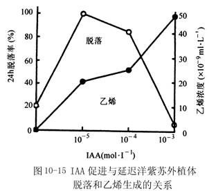 研究还发现,乙烯对脱落的影响受到离层生长素水平的控制。即只有当其生长素含量降低到一定临界值时,才会促进乙烯的合成和器官的脱落。而在高浓度生长素作用下,虽然乙烯增加,却反而抑制脱落(图10-15)。