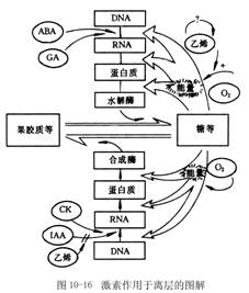 总之,器官脱落是由各种激素间平衡调节的。Addicott(1982)将离层内的激素效应总结如图10-16。脱落的关键是果胶和胞壁等物质和可溶性糖之间的平衡。图的上方是促进水解酶的合成,使细胞壁分解而引起脱落;下方是促进合成酶的形成,延缓脱落。