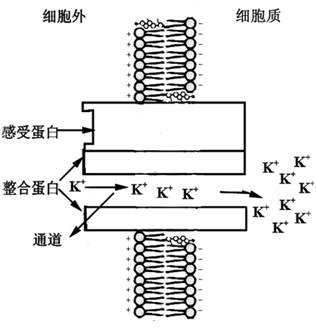 图2-3是一个离子通道的假想模型:跨膜的内部蛋白中央的孔道允许离子(K+)通过。在这里,K+顺电势梯度(由于质膜质子泵产生的细胞质侧过量的负电荷)逆其浓度梯度从通道左侧移向右侧。感受蛋白可对细胞内外由光照、激素或Ca2+引起的化学刺激作出反应。通道上的“门”可以通过某种方式对膜两侧的电势梯度或由环境刺激而产生的化学物质作出开或关的反应。