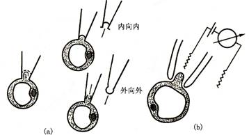玻璃管内施加吸力使膜紧贴电极尖端。与电极尖端紧密接触的小块膜部分即所谓的“片(patch)”。电极抽出时可探截此“膜片”并可根据需要制成内向外(inside-out)或外向外(outside-out)的模型(图2-4)。电极玻璃管内可装入已知的盐浓度。将电极接到高分辨率的放大器上,并按照预先确定的值控制或“钳住(clamp)”跨膜电势差(电压),同时记录通过膜的电流,并以此分析离子通道开关的情况(图2-5)。在此技术中,电极尖端足够小(如直径1mm)时,所探截的膜可能含有单一的离子通道。由于离子通道在生命活动有广泛而深刻作用,因此发明膜片钳技术的E.Nehler和B.Sakmann荣获1991年诺贝尔医学生理奖。
