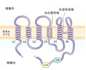除了用膜片钳技术对离子通道进行电生理学研究外,随着分子生物学及分离纯化技术的发展,人们对某些离子通道蛋白(如K+通道)的基因调控、蛋白质氨基酸序列及活性调节机理等均有了一定了解,图2-6为植物内向整流K+通道蛋白(AKT)结构模型。靠近N末端有6个跨膜结构域(S1至S6),靠近C末端有核苷酸结合序列(NB)和类锚蛋白(ankyrin-like)结构域(ANK),S4为电压感受器,其特征是含有几个带正电荷的氨基酸残基。P-结构域或称H5为通道蛋白的进口在离子透过及选择性方面起关键作用。