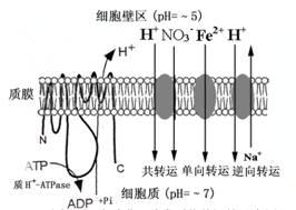 1.质膜H+-ATP酶 质膜H+-ATP酶是植物生命活动的主宰酶(master enzyme),对植物的许多生命活动起着重要的调控作用,其主要功能是在细胞质一侧水解ATP同时把细胞质中H+泵至细胞外,形成跨膜H+电化学势梯度,又称质子驱动力(pmf:proton motive force =ΔpH +ΔΨ)。pmf包括跨膜电势梯度(ΔΨ)(即细胞质膜内侧电位负值,外侧电位正值)和跨膜H+浓度梯度(质膜外浓度高,细胞质一侧质子浓度低)。跨质膜的pmf是植物细胞矿质元素等溶质进行跨膜次级主动转运的主要驱动力。因此,质膜H+-ATP酶对矿质元素的吸收、细胞质pH恒定的维持、细胞的生长和植物对环境因子的响应等有广泛而深刻的作用。质膜H+-ATP酶分子量约100 kDa单一多肽,其N末端和C末端均在细胞质侧,C末端为自抑制区末端,Fusicoccin(克梭孢菌素)和