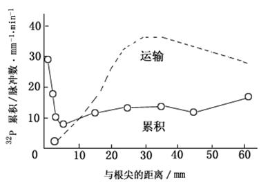 1.根系对矿质元素的吸收部位 关于根部吸收矿质元素的部位,有实验证明,根毛区积累的离子数虽较少,但该部位的木质部已分化完全,所吸收的离子能较快地运出。根尖顶端虽有大量离子积累,而该部位无疏导组织,离子不易运出(图2-12)。综合离子积累和运出的结