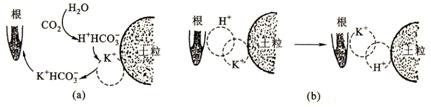 对于被土壤胶体吸附着的矿物质,根部细胞可通过两种方式进行交换吸附。①通过土壤溶液间接进行。根部呼吸放出的CO2与土壤溶液中的H2O形成H2CO3,H2CO3从根表面逐渐接近土粒表面,土粒表面吸附的阳离子(如K+)与H2CO3的H+进行离子交换(ion exchange),H+被土粒吸附,K+进入土壤溶液(形成KHCO3),当K+接近根表面时,再与根表面的H+进行交换吸附,K+即被根细胞吸附(图2-13a)。K+也可能连同HCO3-一起进入根部。在此过程中,土壤溶液好似“媒介”将根细胞与土粒之间的离子交换联系起来。②直接交换。根部和土壤颗粒表面上的离子是在吸附位置上不断震动着的。如果根部和土壤颗粒之间的距离小于离子震动的空间,土壤颗粒上的阳离子和根表面的H+便可以不通过土壤溶液而直接交换,根部从而得到阳离子(图2-13b)。这种方式的交换也称为接触交换(contact exchange)。