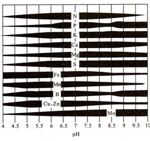 图2-14土壤溶液pH对矿质元素可利用性的影响