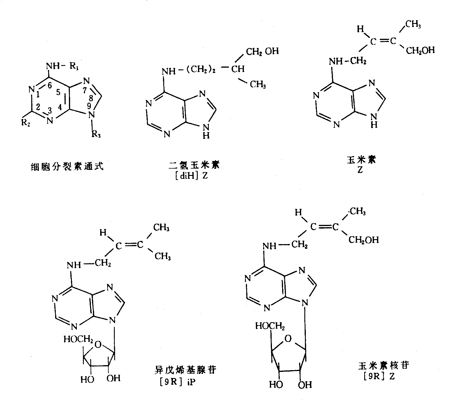 细胞分裂素是腺嘌呤(adenine)的衍生物。当第6位氨基、第2位碳原子和第9位氮原子上的氢原子被取代后,则形成各种不同的细胞分裂素。细胞分裂素可分为天然和人工合成两大类。