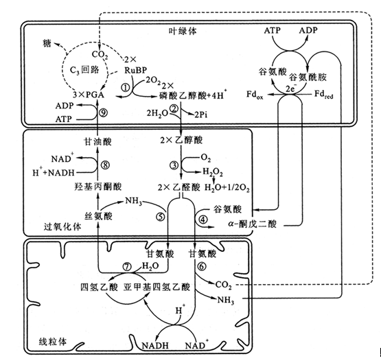 ①Rubisco;②磷酸乙醇酸磷酸酯酶;③乙醇酸氧化酶;④谷氨酸乙醛酸转氨酶;⑤丝氨酸乙醛酸转氨酶;⑥甘氨酸脱羧酶;⑦丝氨酸羟甲基转移酶;⑧羟基丙酮酸还原酶;⑨甘油酸激酶 (引自李合生等,2002)