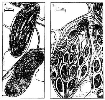 C4植物叶片的维管束鞘薄壁细胞较大,其中含有许多较大的叶绿体,叶绿体没有基粒或基粒发育不良;维管束鞘的外侧紧密排列一层环状或近于环状的叶肉细胞,组成了“花环型”(Kranz type)结构。这种结构是C4植物的特征。叶肉细胞内的叶绿体数目较少,个体小,有基粒(图3-29)。