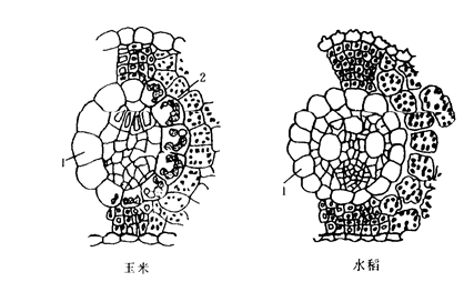 图3-30 C4植物(玉米)与C3植物(水稻)叶片解剖结构的差异