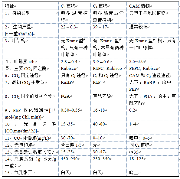 综上所述,把C4植物、C3植物和CAM植物主要的光合和生理特征总结于表3-5。