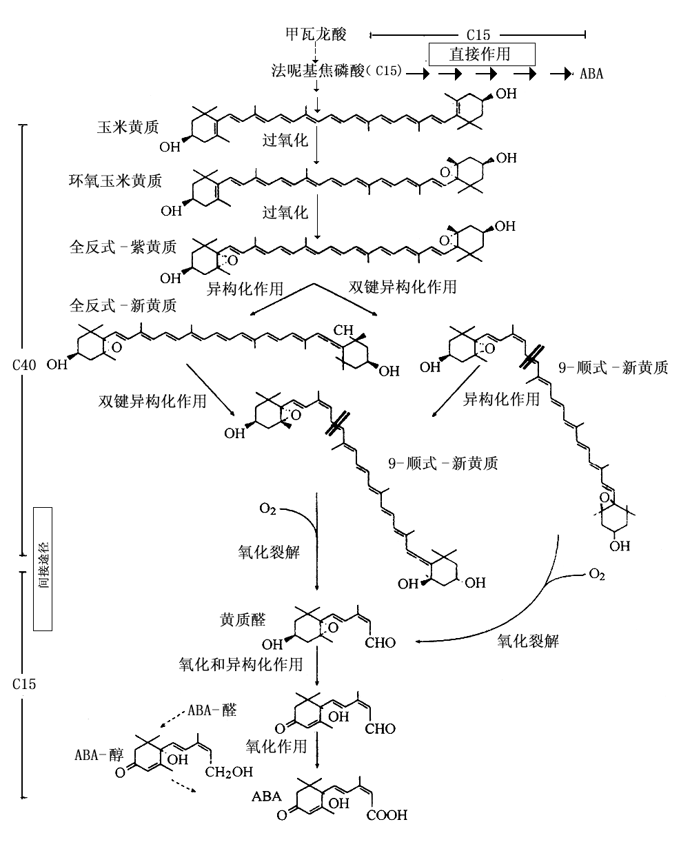 脱落酸的生物合成主要有两条途径。(1)C15的直接途径:由甲瓦龙酸(MVA)生成法呢基焦磷酸(FPP),再形成ABA,即MVA→FPP→ABA。这一途径是否存在于高等植物中,目前证据尚不充分。(2)C40的间接途径:ABA由类胡萝卜素如紫黄质(violaxanthin)裂解形成。李义和Walton(1990)发现干旱中的黄化菜豆叶片内,有3种叶黄素的含量下降伴随着ABA含量的上升,这3种叶黄素分别是全反式堇菜黄素(all-trans- violaxanthin )、9’-顺式堇菜黄素(9’-cis- violaxanthin)和9’-顺式新黄素(9’-cis-neoxanthin)。9’-顺式新黄素是ABA直接的未裂解前体,因此9’-顺式新黄素的裂解反应在ABA合成过程中起限速作用,催化此反应的酶存在于叶绿体中。干旱等胁迫条件下,该酶的合成量或活性增加,使黄质醛(xanthoxin , XAN)形成加快,ABA大量合成。另外研究还表明,ABA