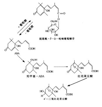 1、氧化降解途径 ABA在单加氧酶的作用下,首先形成8’-羟基ABA,该物质极不稳定,很容易氧化形成略有活性的红花菜豆酸(phaseic acid , PA),PA进一步被还原为完全失去活性的二氢红花菜豆酸(dihydrophaseic acid , DPA)。脱落酸氧化降解的产物8’-羟基ABA 、PA和DPA均可形成相应的结合态,如在苍耳、芒果等中存在的PA-β-葡萄糖酯,从鳄梨和葡萄中发现的DPA-4’-O-葡萄糖苷。
