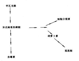 图6-31 赤霉素、细胞分裂素和脱落酸三者之间的合成关系(引自潘瑞炽,2001)