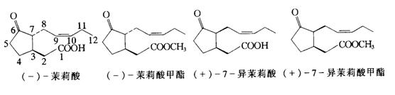De Mole等于1962年首次从茉莉属素馨花(Jasminum grandiflorum)的香精油中分离到一种香味物质—茉莉酸甲酯(methyl jasmonate,MJ)。1971年Aldridge等又从真菌(Lasiodiplodia theobromae)培养液中分离出游离的茉莉酸(jasmonic acid,JA)。后来人们在苦艾、蚕豆和菜豆等多种植物中均检测到茉莉酸和茉莉酸甲酯。经多年研究,迄今已陆续发现多种在化学结构和生理功能上与茉莉酸相类似的化合物,我们把这些具有茉莉酸基本结构和功能的化合物统称为茉莉酸类化合物(jasmonates , JAs)。到1999年为止,植物中已发现的茉莉酸类化合物成员有25种,其中茉莉酸和茉莉酸甲酯是最重要的代表。