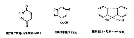 植物生长抑制剂(plant growth inhibitors)的基本特征是抑制顶端分生组织细胞伸长和分化,促进侧枝的分化和生长,使植物丧失顶端优势,植株形态发生很大的变化。外施生长素等可以逆转这种抑制效应,而外施赤霉素则无效。常用的植物生长抑制剂有以下几种(图6-40):