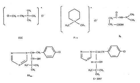 植物生长延缓剂(plant growth retardants)的基本特征是抑制内源赤霉素的生物合成,从而抑制近顶端分生组织的细胞延长,使节间缩短,但叶数和节数不变,生殖器官不受影响或影响不大,株型紧凑、矮小。外施赤霉素可逆转生长延缓剂的抑制作用。不同种类的生长延缓剂抑制赤霉索生物合成过程中的不同环节。如:CCC抑制赤霉素生物合成过程中的GGPP至内根-贝壳杉烯的过程;PP333、S-3307和B9抑制内根-贝壳杉烯至内根-贝壳杉烯酸的合成。生长延缓剂都是抗赤霉素物质。一般来说,施用生长延缓剂后植株矮小、茎粗、节间短、叶面积小、叶厚和叶色深绿。农业生产上常用于培育壮苗和矮化防倒伏等。生产上常用的植物生长延缓剂有以下几种(图6-41):
